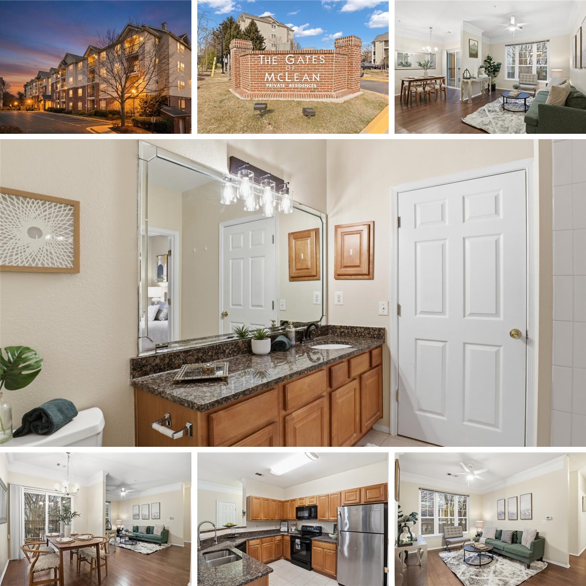Elegant top-floor 3BR/2BA residence in the gated community of Gates of McLean, just steps from McLean Metro (Silver Line). This beautifully updated 1,272 sq ft home features wide-plank engineered wood flooring, refined lighting fixtures, crown moldings, and a bright open-concept layout. The spacious living and dining areas open to a private balcony overlooking a peaceful, landscaped courtyard.