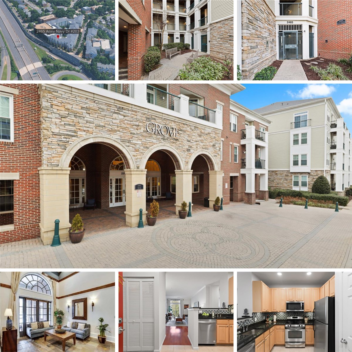 Beautiful and spacious 1-bedroom, 1-bath condo with a comfortable and functional layout, located at The Grove at Arlington. Well maintained with a newer HVAC & Water Heater (2023). This unit comes with 2 Assigned Garage Parking Spaces (1 with Private Garage Door Access). Features include a kitchen with granite countertops, tile backsplash, recessed lighting, stainless steel appliances (gas range), and a bar-height counter—perfect for casual seating with bar stools. A spacious coat closet and a laundry closet with full-size washer and dryer units, plus extra storage, are located just off the kitchen. The open living area offers engineered hardwood floors, crown molding, and access to a private balcony. Perfect for morning coffee or relaxing in the evening! There's ample room for a dining table in the living area, providing flexibility for both everyday living and entertaining. A small hallway separates the main living area from the bedroom, providing added privacy. The bedroom is spacious, fully carpeted and includes a walk-in closet. Bathroom features a large soaking tub / shower and space for additional storage or shelving. Community amenities include: Outdoor pool with lap lanes, Fitness center, Media room, business center, and library, Lounge, party room, and billiards, Outdoor grills and picnic area, Secure package/mail room, and On-site professional management. Transit-friendly location with a bus stop just outside the building that connects directly to the Pentagon Metro (1.4 miles away). Quick access to I-395 makes commuting into D.C. and across Northern Virginia easy. Convenient to key destinations: Reagan National Airport, The Pentagon, Downtown DC & Georgetown, Shirlington Village, Old Town Alexandria and much more! Location. Convenience. Amenities. Don’t miss your chance to make 2465 Army Navy Dr., #203, Arlington, VA 22206 your next home.