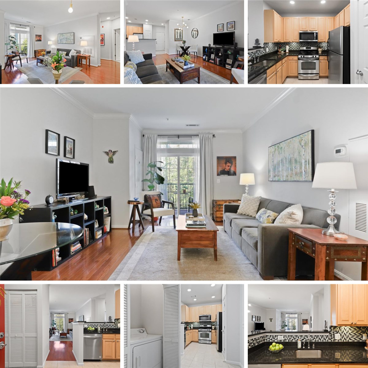 Beautiful and spacious 1-bedroom, 1-bath condo with a comfortable and functional layout, located at The Grove at Arlington. Well maintained with a newer HVAC & Water Heater (2021). This unit comes with 2 Assigned Garage Parking Spaces (1 with Private Garage Door Access). Features include a kitchen with granite countertops, tile backsplash, recessed lighting, stainless steel appliances (gas range), Microwave & Dishwasher (2021), and a bar-height counter—perfect for casual seating with bar stools. A spacious coat closet and a laundry closet with full-size washer and dryer units, plus extra storage, are located just off the kitchen. The open living area offers engineered hardwood floors, crown molding, and access to a private balcony. Perfect for morning coffee or relaxing in the evening! There's ample room for a dining table in the living area, providing flexibility for both everyday living and entertaining. A small hallway separates the main living area from the bedroom, providing added privacy. The bedroom is spacious, fully carpeted and includes a walk-in closet. Bathroom features a large soaking tub / shower and space for additional storage or shelving. Community amenities include: Outdoor pool with lap lanes, Fitness center, Media room, business center, and library, Lounge, party room, and billiards, Outdoor grills and picnic area, Secure package/mail room, and On-site professional management. Transit-friendly location with a bus stop just outside the building that connects directly to the Pentagon Metro (1.4 miles away). Quick access to I-395 makes commuting into D.C. and across Northern Virginia easy. Convenient to key destinations: Reagan National Airport, The Pentagon, Downtown DC & Georgetown, Shirlington Village, Old Town Alexandria and much more! Location. Convenience. Amenities. Don’t miss your chance to make 2465 Army Navy Dr., #203, Arlington, VA 22206 your next home.
